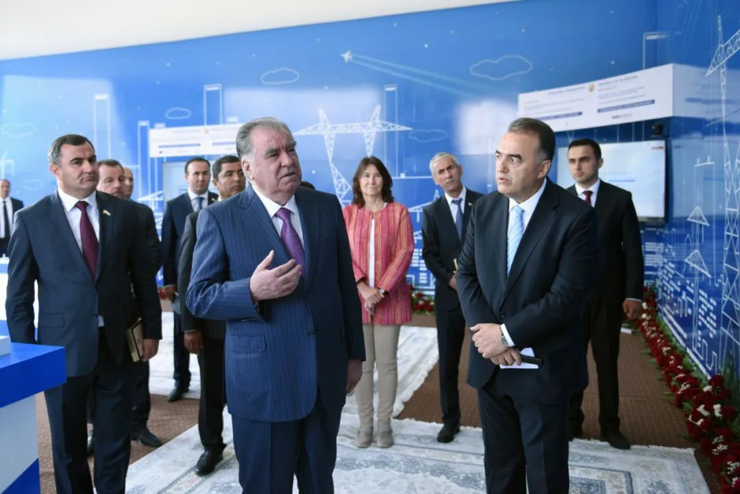 ▲塔吉克斯坦能源和水资源部长达勒·朱马向埃莫马利·拉赫蒙总统介绍华自科技及项目实施情况